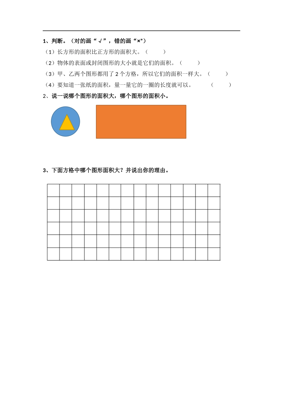 1、判断。(对的画“√”,错的画“×”)(1)长方形的面积比正方形的面积大。()(2)物体的表面或封闭图形的大小就是它们的面积。()(3)甲、乙两个图形都用了2个方格,所以它们的面积一样大。()(4)要...