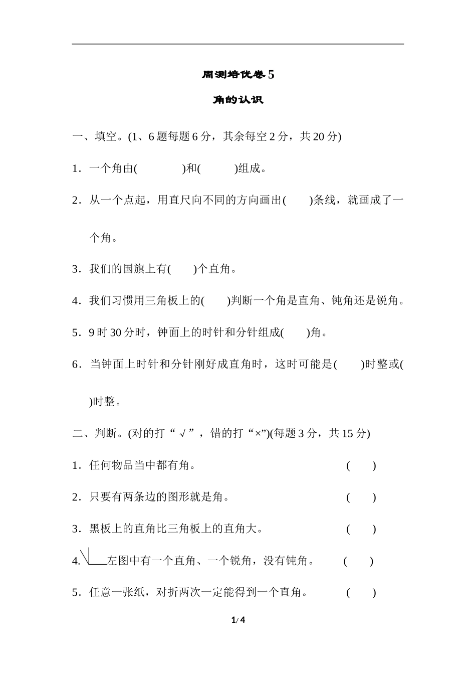 周测培优卷5角的认识一、填空。(1、6题每题6分,其余每空2分,共20分)1.一个角由()和()组成。2.从一个点起,用直尺向不同的方向画出()条线,就画成了一个角。3.我们的国旗上有()个直角。4.我们习惯用三角板上...