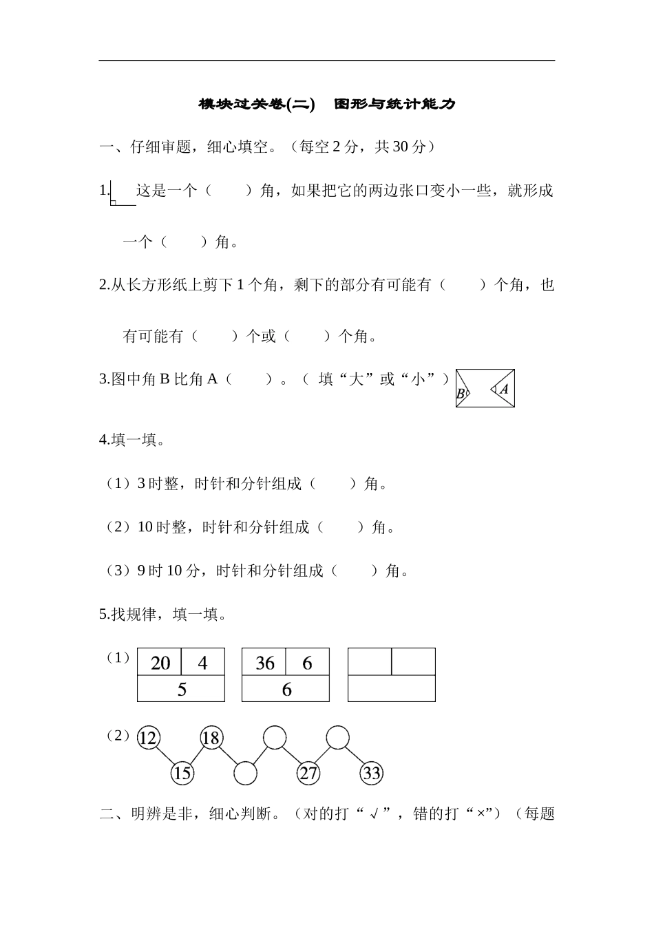 模块过关卷(二)图形与统计能力一、仔细审题,细心填空。(每空2分,共30分)1.这是一个()角,如果把它的两边张口变小一些,就形成一个()角。2.从长方形纸上剪下1个角,剩下的部分有可能有()个角,也有可能...