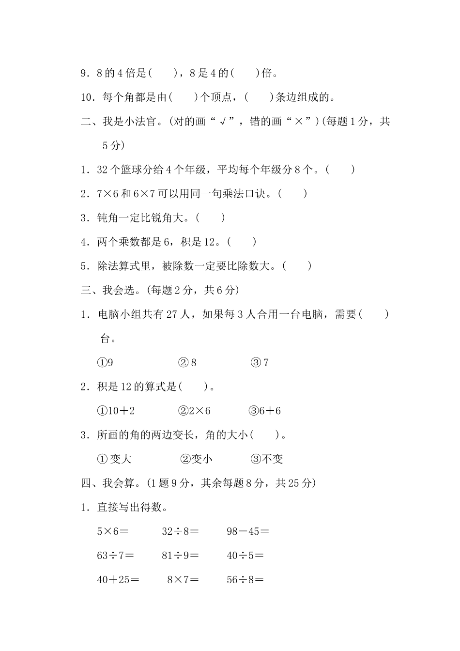 期末检测卷及答案一、我会填。(每空1分,共26分)1.用五九四十五这句口诀计算的两个除法算式是()和()。2.72支铅笔,平均分给9个小朋友,每个小朋友分()支。3.除数是9,商是3,被除数是()。4.5+5+5=()×()7...
