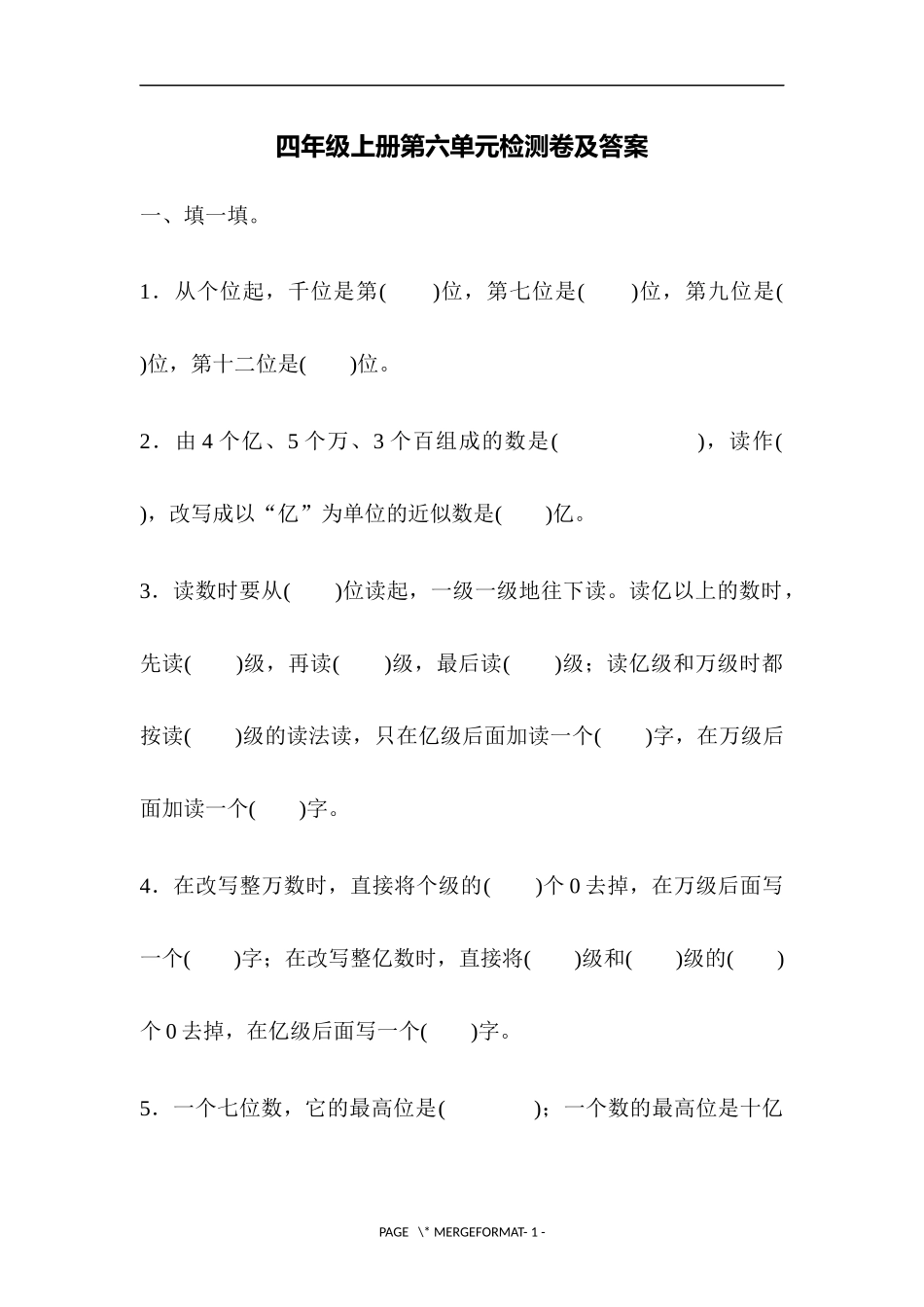 四年级上册第六单元检测卷及答案一、填一填。1.从个位起,千位是第()位,第七位是()位,第九位是()位,第十二位是()位。2.由4个亿、5个万、3个百组成的数是(),读作(),改写成以“亿”为单位的近似数是()亿。3...