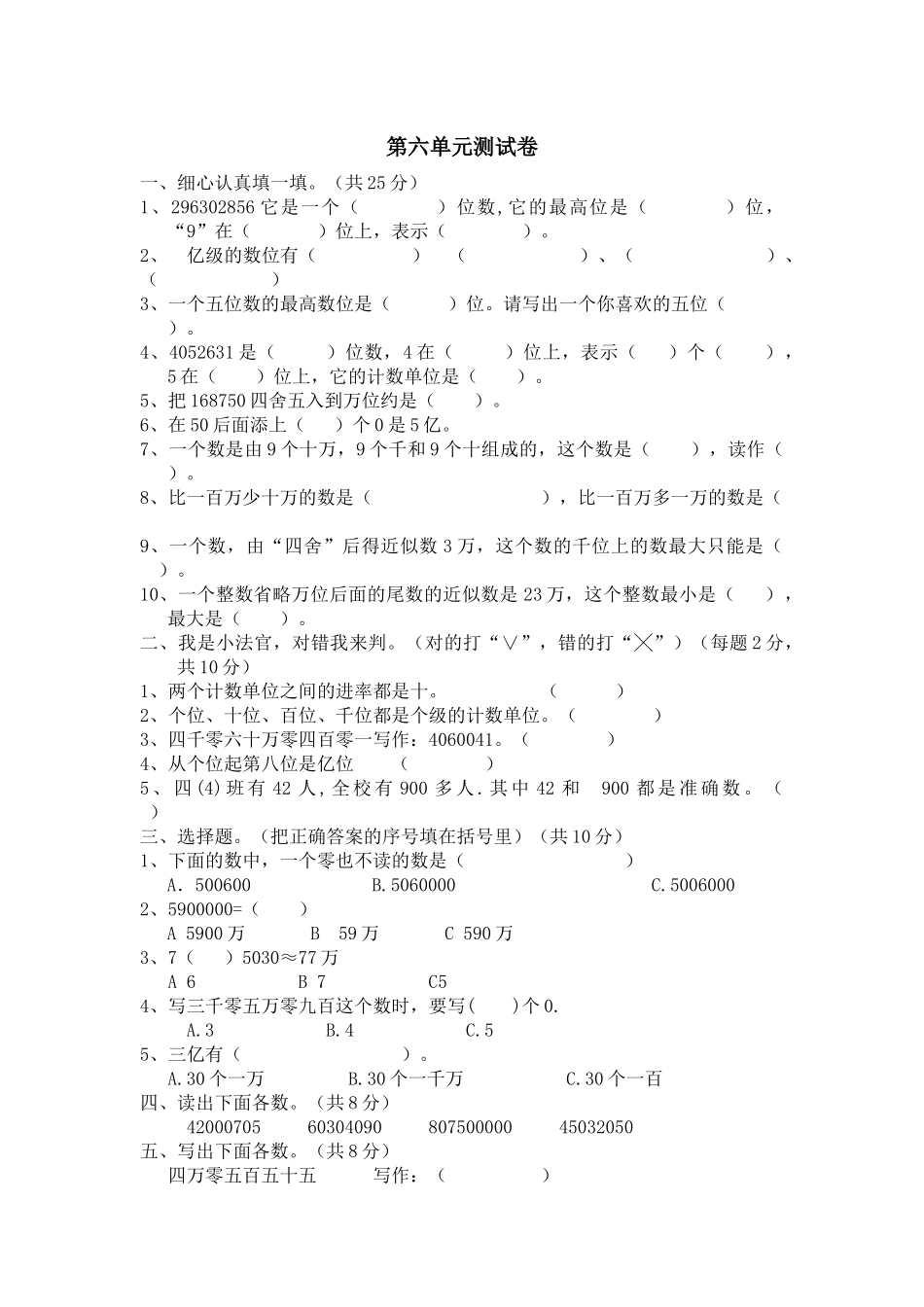 第六单元测试卷一、细心认真填一填。(共25分)1、296302856它是一个()位数,它的最高位是()位,“9”在()位上,表示()。2、亿级的数位有()()、()、()3、一个五位数的最高数位是()位。请写出一...