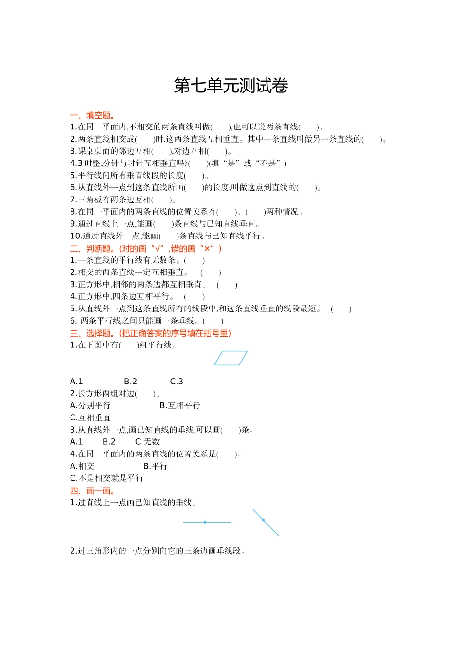 第七单元测试卷一、填空题。1.在同一平面内,不相交的两条直线叫做(),也可以说两条直线()。2.两条直线相交成()时,这两条直线互相垂直。其中一条直线叫做另一条直线的()。3.课桌桌面的邻边互相(),对边互相()。4.3时...