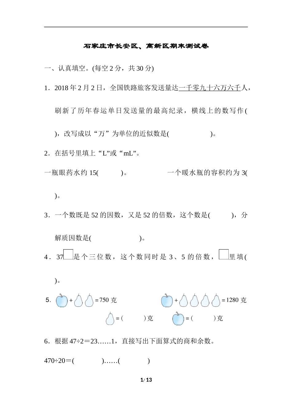 石家庄市长安区、高新区期末测试卷一、认真填空。(每空2分,共30分)1.2018年2月2日,全国铁路旅客发送量达一千零九十六万六千人,刷新了历年春运单日发送量的最高纪录,横线上的数写作(),改写成以“万”为单位...
