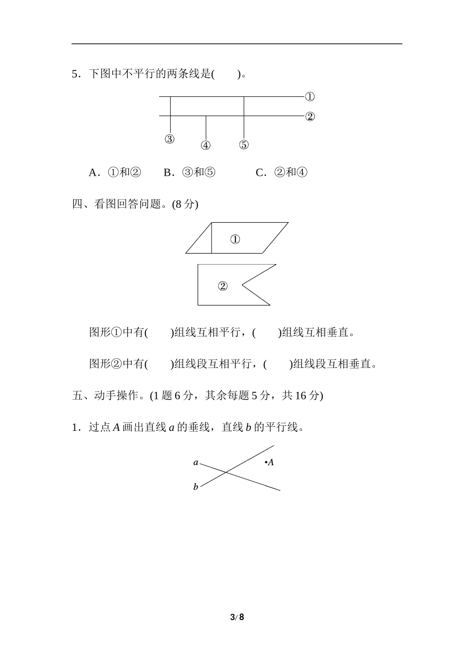 周测培优卷11垂直和平行的认识及画法一、填空。(每空2分,共26分)1.同一平面内的两条直线可能(),也可能()。2.同一平面内的直线a和直线b不相交,我们就说直线a和直线b(),也可以说直线a是直线b的()。3.两条直...