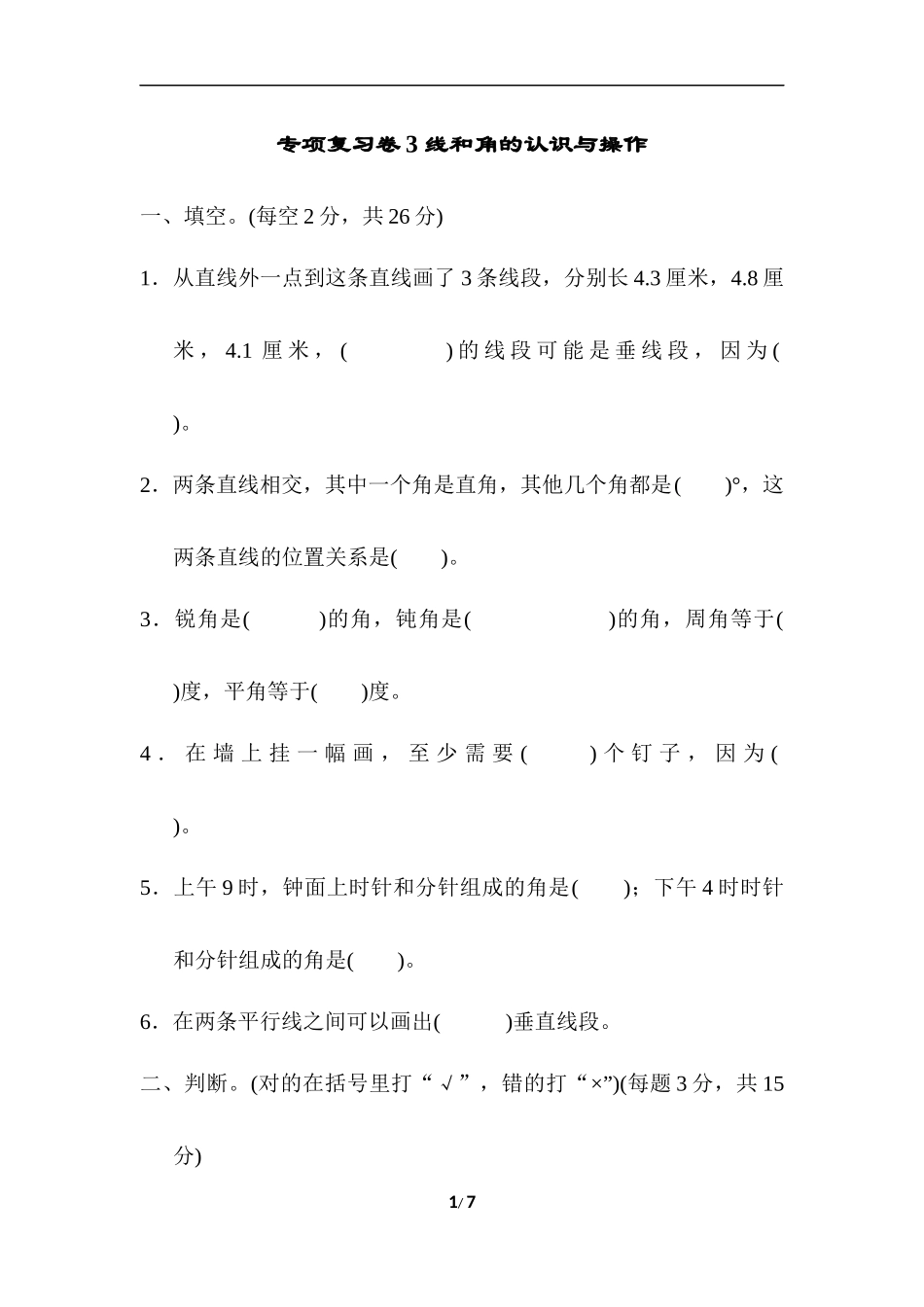 专项复习卷3线和角的认识与操作一、填空。(每空2分,共26分)1.从直线外一点到这条直线画了3条线段,分别长4.3厘米,4.8厘米,4.1厘米,()的线段可能是垂线段,因为()。2.两条直线相交,其中一个角是直角,其他...