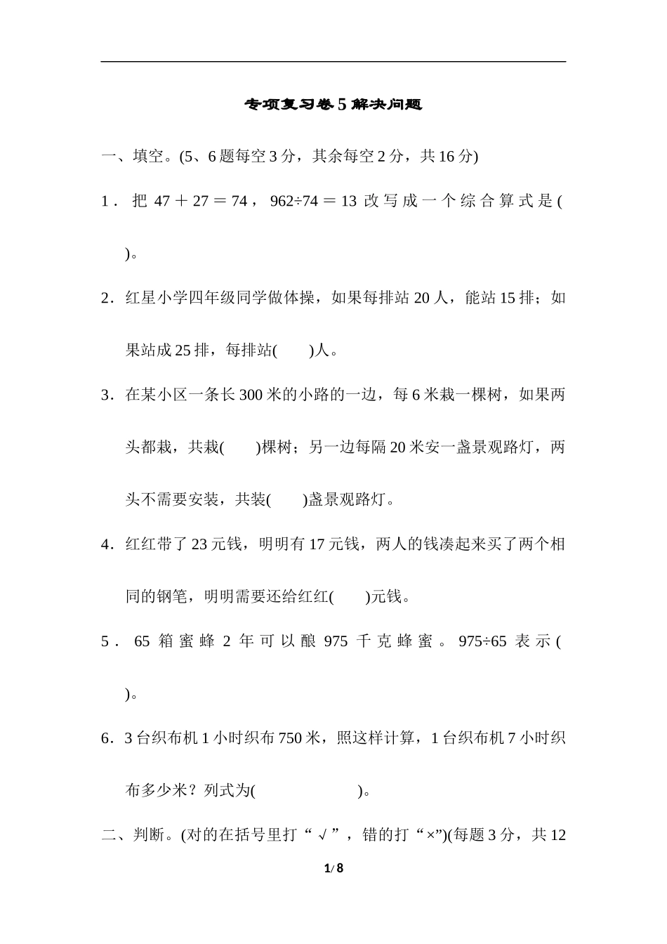 专项复习卷5解决问题一、填空。(5、6题每空3分,其余每空2分,共16分)1.把47+27=74,962÷74=13改写成一个综合算式是()。2.红星小学四年级同学做体操,如果每排站20人,能站15排;如果站成25排,每排站()人...