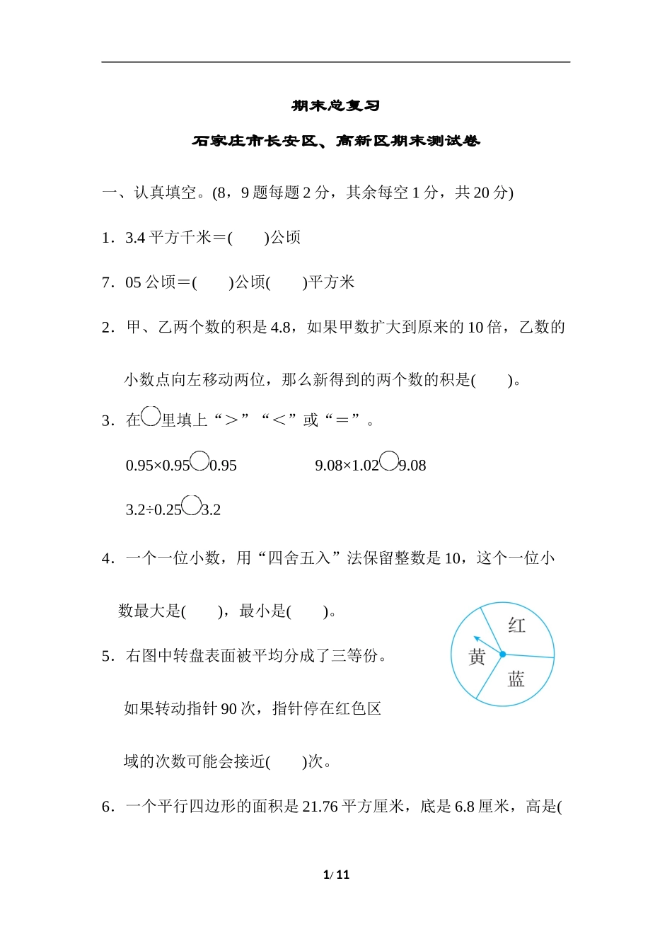 期末总复习石家庄市长安区、高新区期末测试卷一、认真填空。(8,9题每题2分,其余每空1分,共20分)1.3.4平方千米=()公顷7.05公顷=()公顷()平方米2.甲、乙两个数的积是4.8,如果甲数扩大到原来的10倍,乙数的...