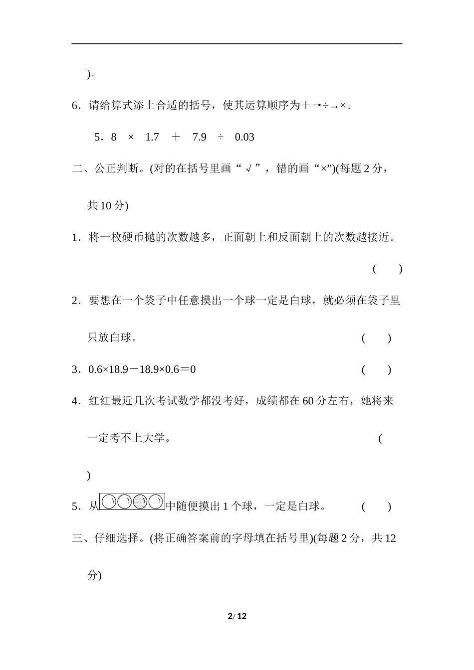 第四、五单元跟踪检测卷一、认真填空。(5、6题各2分,其余每空1分,共16分)1.如图,把8张奖票反扣在桌子上,任意摸出一张,摸到()等奖的可能性最大,摸到()等奖的可能性最小。2.计算15.4÷[8×(6.34-4.59)]时...