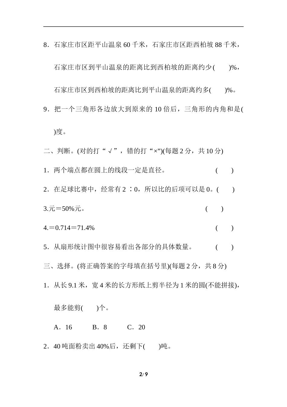 满分压轴卷1常考易错突破卷(一)一、填空。(每空2分,共26分)1.在一个长6厘米,宽5厘米的长方形内剪下一个最大的圆,这个圆的半径是()厘米。2.把1∶1.25化成最简单的整数比是(),比值是()。3.北京张家口冬奥会...