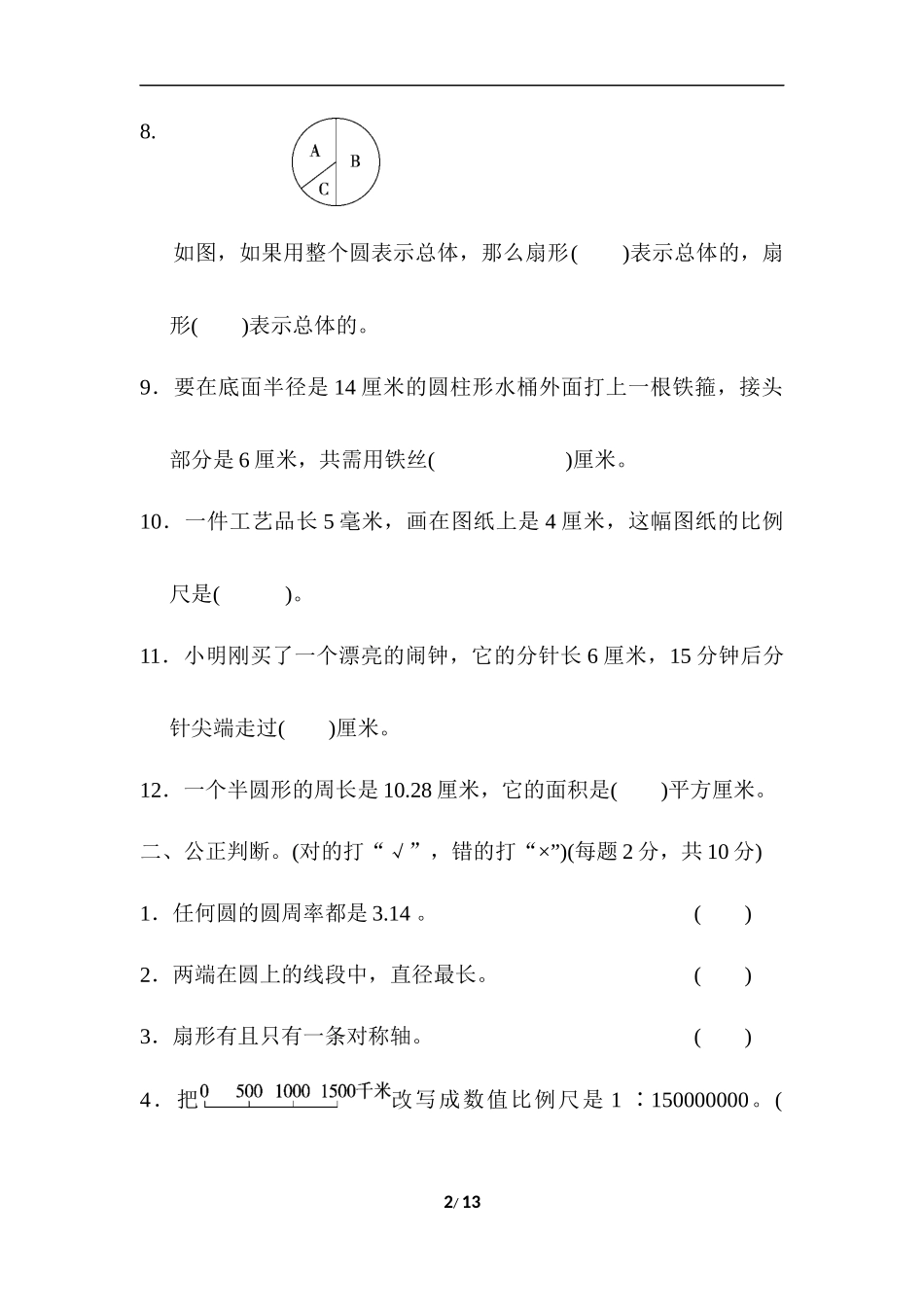 模块过关卷(二)空间与图形统计与概率一、认真填空。(每空1分,共17分)1.圆周率表示一个圆的()和()的倍数关系。2.要反映某食品中各种营养成分的含量,最好选用()统计图。3.地图上20厘米的距离表示实际距离40千...