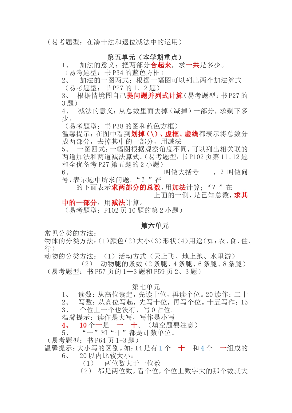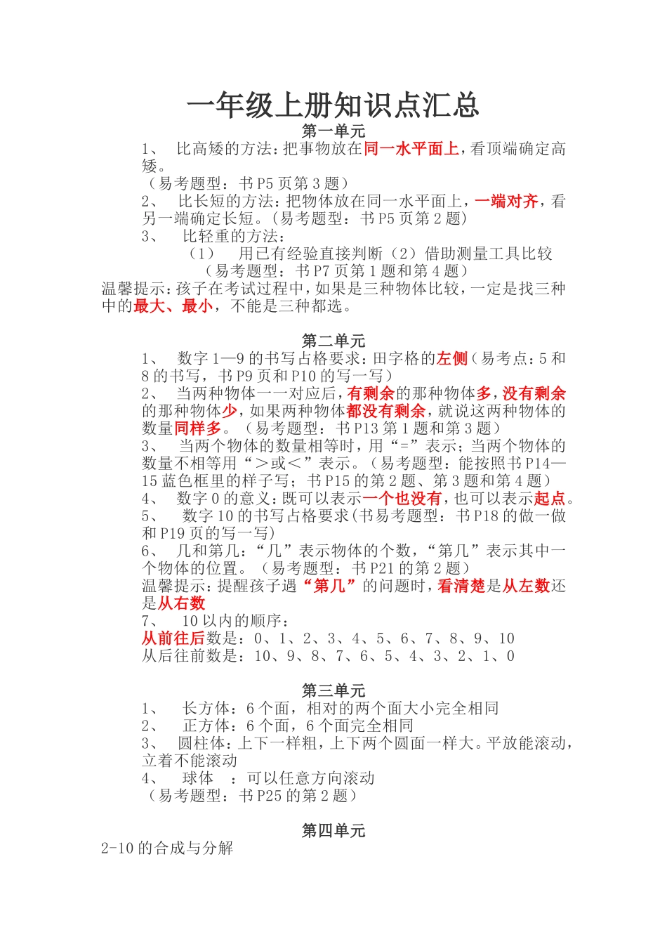 一年级上册知识点汇总第一单元1、比高矮的方法:把事物放在同一水平面上,看顶端确定高矮。(易考题型:书P5页第3题)2、比长短的方法:把物体放在同一水平面上,一端对齐,看另一端确定长短。(易考题型:书P5页...