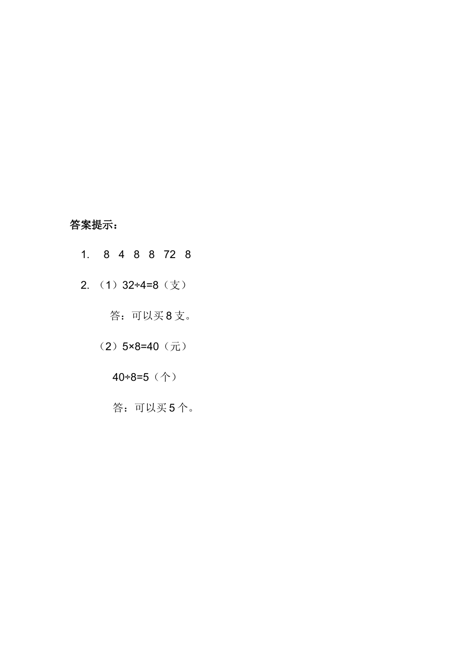 第9课时用8的乘法口诀求商一、填空题()×4=3232÷()=87×()=565×()=40()÷8=964÷()=8二、应用题一支钢笔4元一个本8元文具盒5元(1)明明用32元可以买几支钢笔?(2)用买8个文具盒的钱可以买多少个...