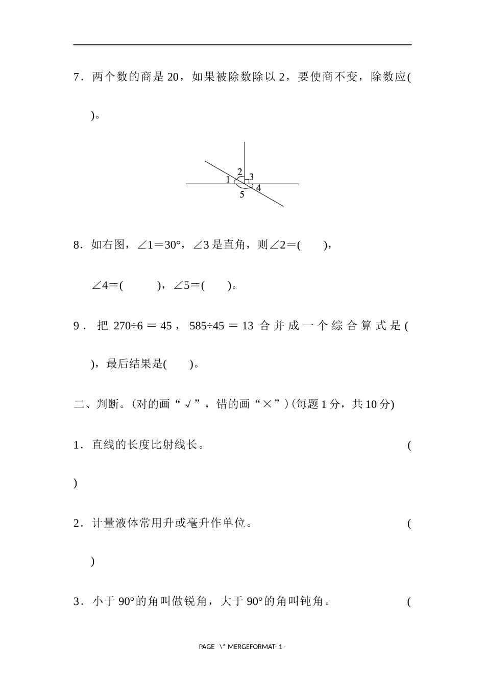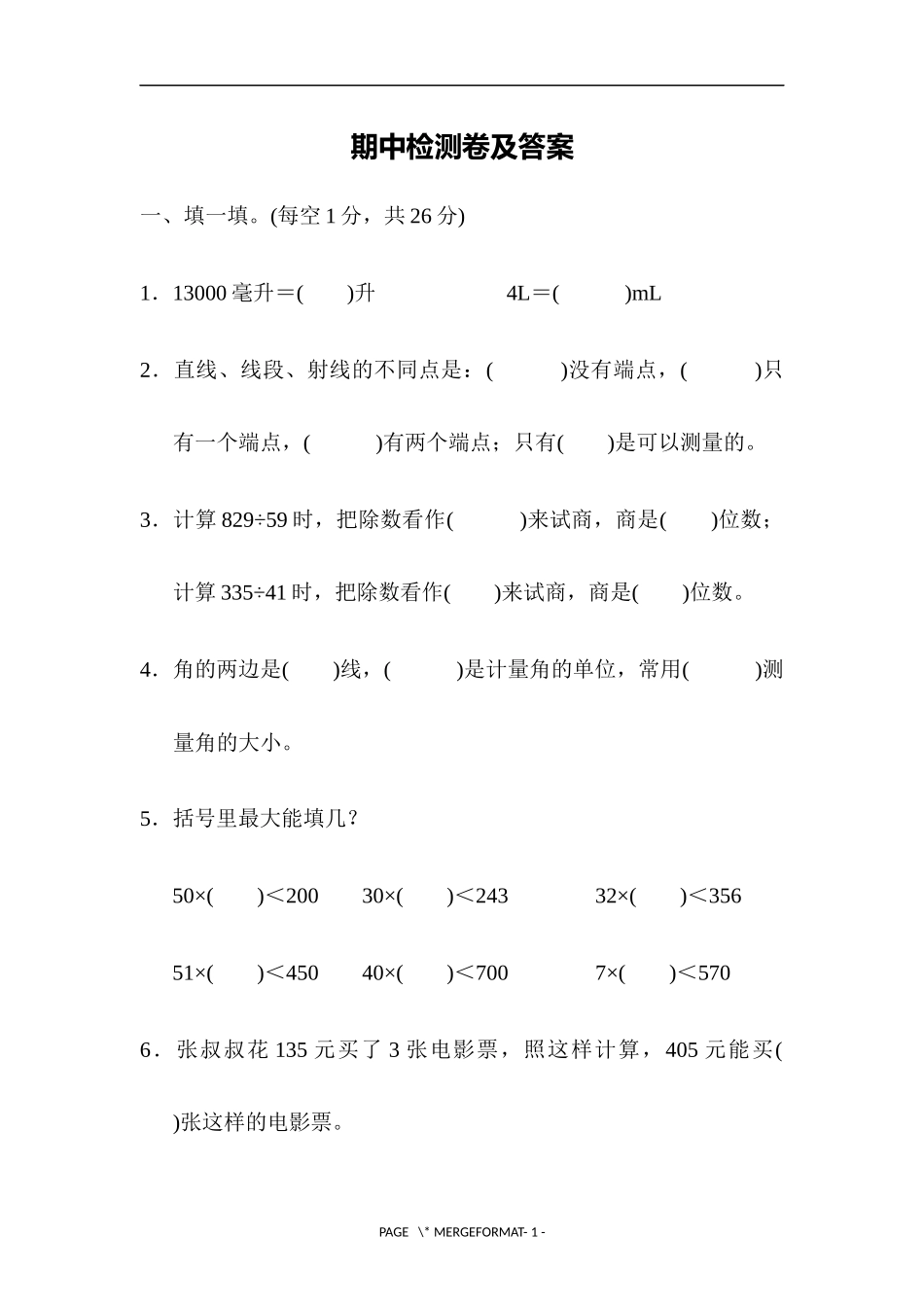 期中检测卷及答案一、填一填。(每空1分,共26分)1.13000毫升=()升4L=()mL2.直线、线段、射线的不同点是:()没有端点,()只有一个端点,()有两个端点;只有()是可以测量的。3.计算829÷59时,把除数看作()来...