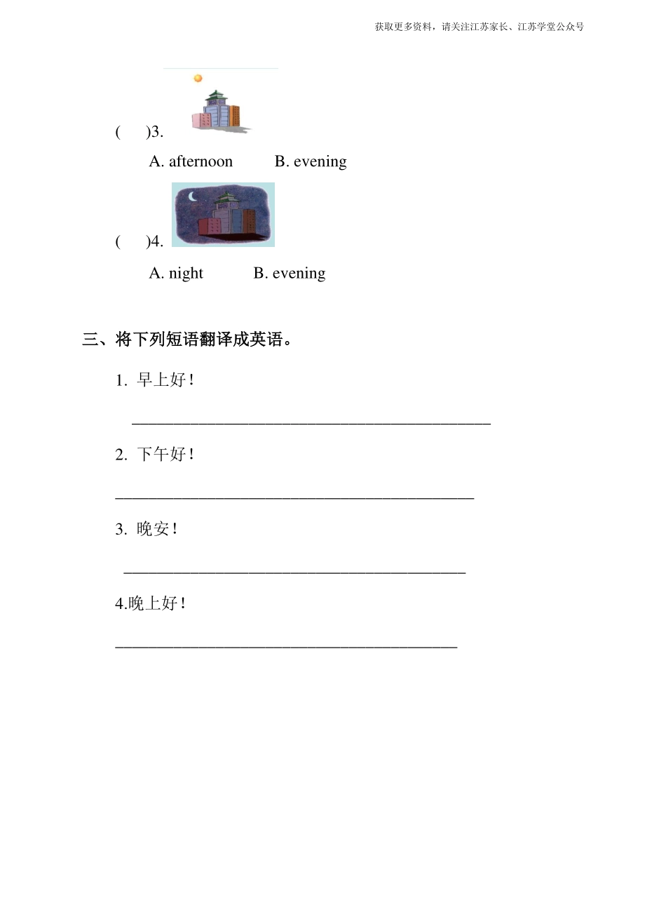 获取更多资料,请关注江苏家长、江苏学堂公众号Unit2Goodmorning第一课时习题一、连线题。1.GoodmorningA2.GoodafternoonB3.GoodeveningC4.GoodnightD二、选出与图片相应的单词()1.A.morningB.afternoon()2.A.aft...