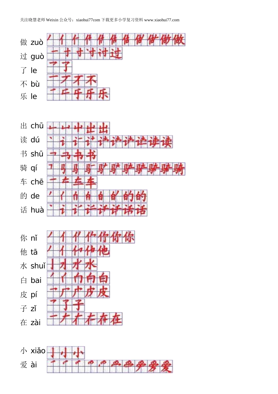 关注晓慧老师Weixin公众号:xiaohui77com下载更多小学复习资料www.xiaohui77.com人教版一年级语文上册生字表(一)笔顺小学电子版学习资料生字表(一)共400个字汉语拼音爸bà妈mā我wǒ大dà米mǐ土tǔ地dì马m...