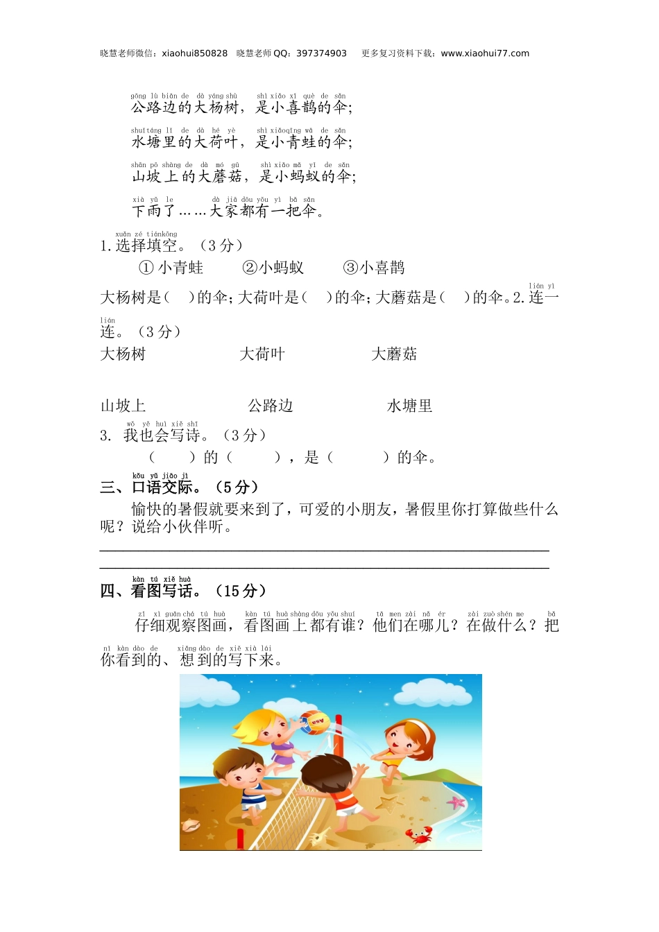 shēngdòngzuǒyòuběijīngyuǎnjìnyǐjīngshēntǐ晓慧老师微信:xiaohui850828晓慧老师QQ:397374903更多复习资料下载:www.xiaohui77.com人教版小学一年级语文下册期末语文综合测试卷1时间:60分钟,满分...