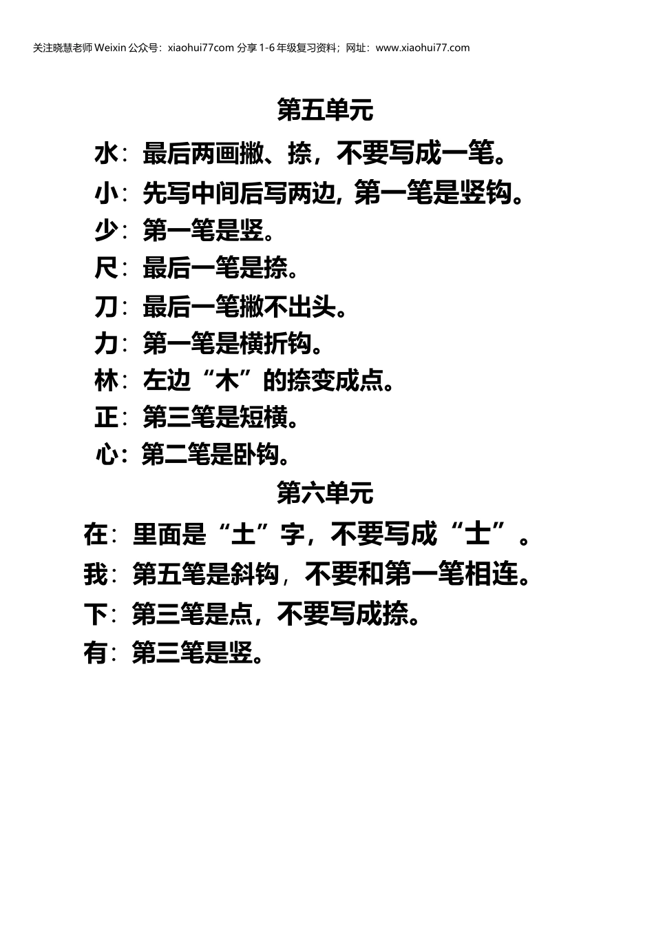 关注晓慧老师Weixin公众号:xiaohui77com分享1-6年级复习资料;网址:www.xiaohui77.com一年级语文易错字汇总第一单元口:第二笔是横折。耳:第三笔是竖。手:第一笔是撇,第四笔是弯钩。火:注意笔顺是点、撇、...
