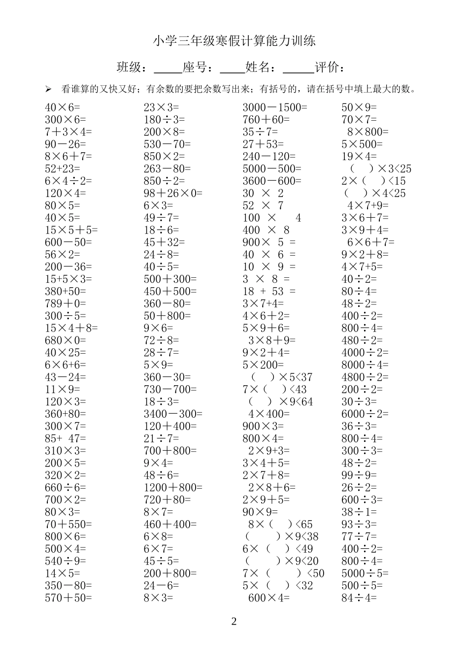 1小学三年级寒假计算能力训练班级:座号:姓名:评价:看谁算的又快又好;有余数的要把余数写出来;有括号的,请在括号中填上最大的数。25×2=25×4=25×6=25×8=25×3=25×5=25×7=25×9=35×7=35×9...