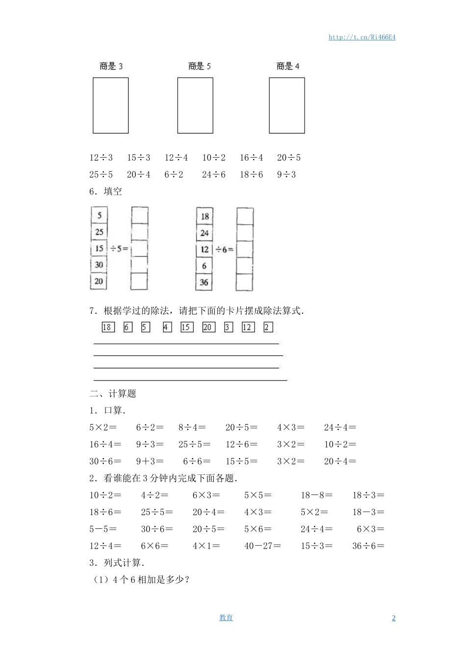 http://t.cn/Ri466E4苏教版二年级数学上册第4单元表内除法(一)习题精选一、填空题1.在○里填上“+”、“-”、“×”或“÷”.(1)3○3=6(2)3○3=9(3)3○3=0(4)3○3=1(5)12○2=10(6)4○2=6...