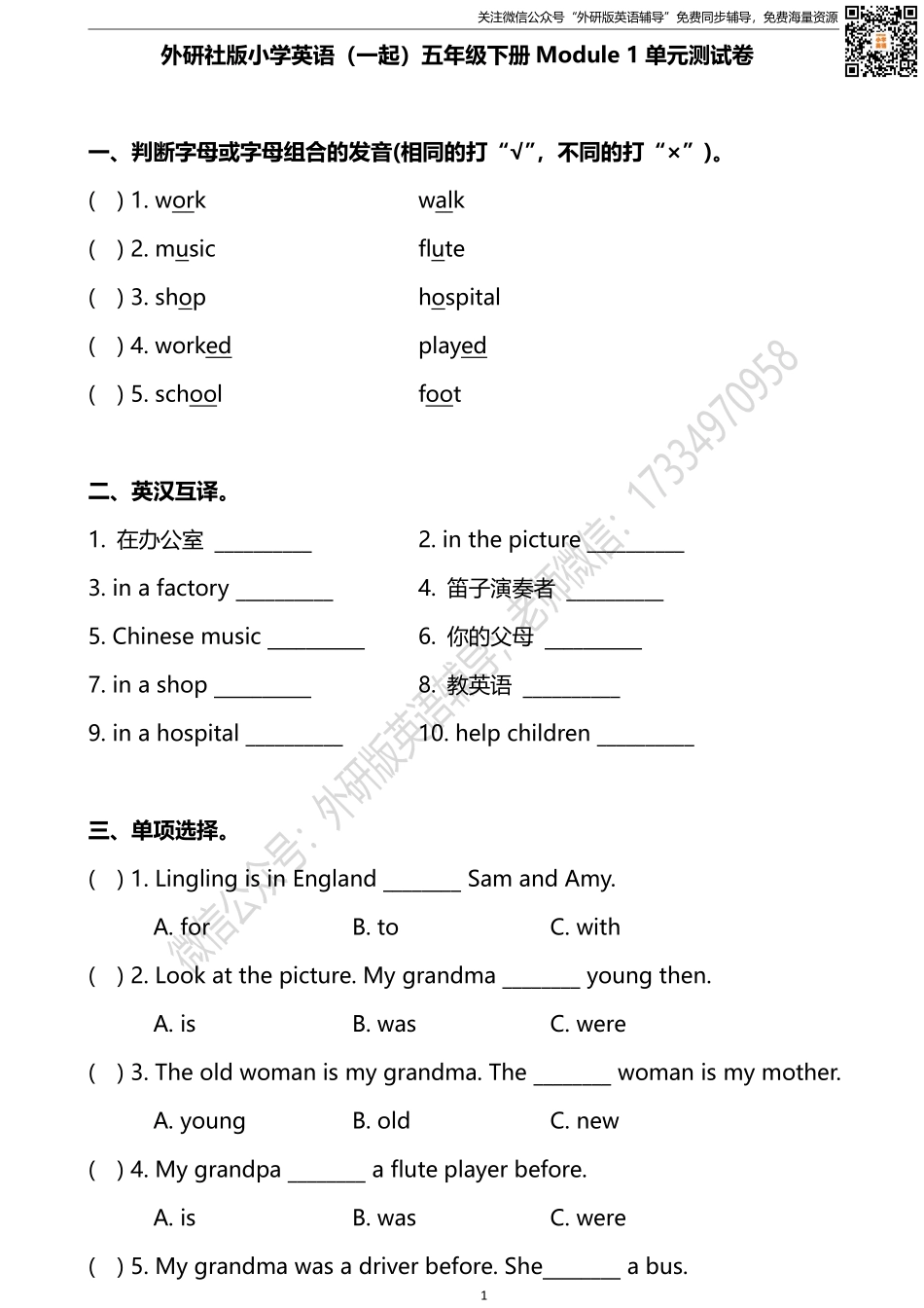关注微信公众号“外研版英语辅导”免费同步辅导,免费海量资源1外研社版小学英语(一起)五年级下册Module1单元测试卷一、判断字母或字母组合的发音(相同的打“√”,不同的打“×”)。()1.workwalk()2.musicflut...