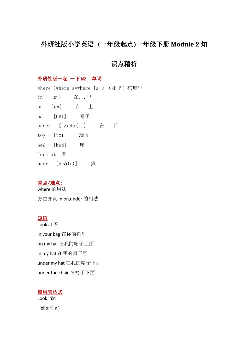 外研社版小学英语(一年级起点)一年级下册Module2知识点精析外研社版一起一下M2单词where(where's=whereis)(哪里)在哪里in[ɪn]在...里on[ɒn]在...上hat[hæt]帽子under['ʌndə(r)]在...下toy[tɔɪ]玩具bed...