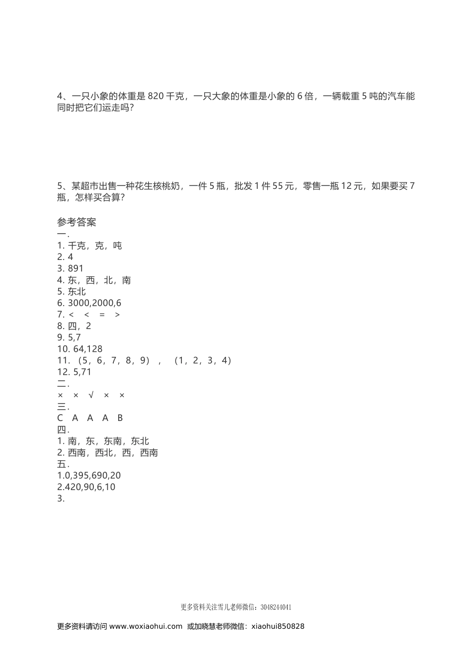 西师版三年级上册数学期中检测卷及答案一、填空。(共27分)1、在括号里填上合适的重量单位。小明体重35()。一包食盐重500()。一头大象约重4()。2、每袋袋装果干的净含量是500克,买()袋这样的果干的净含...