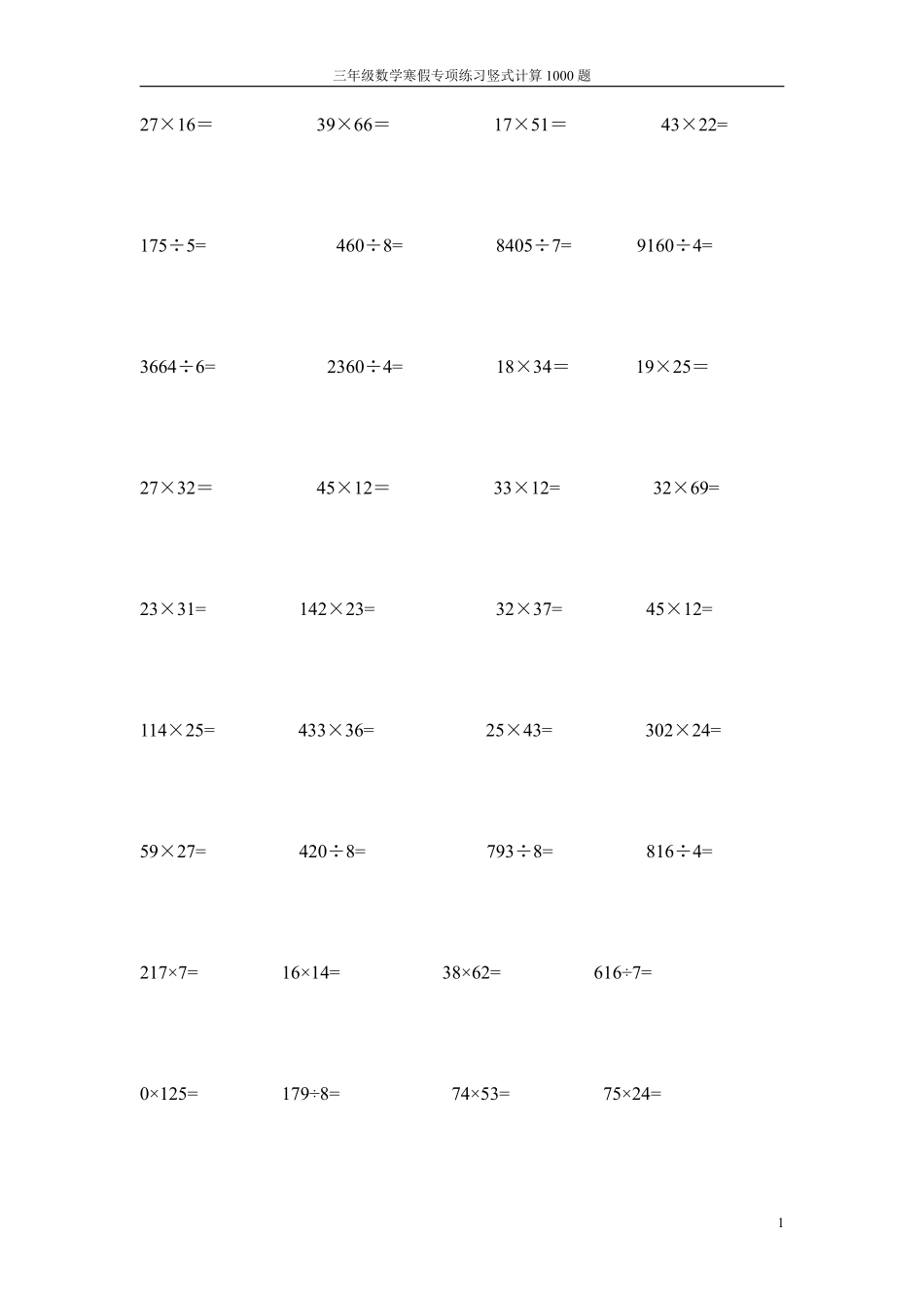 三年级数学寒假专项练习竖式计算1000题127×16=39×66=17×51=43×22=175÷5=460÷8=8405÷7=9160÷4=3664÷6=2360÷4=18×34=19×25=27×32=45×12=33×12=32×69=23×31=142×23=32×37=45×12=114×25=...