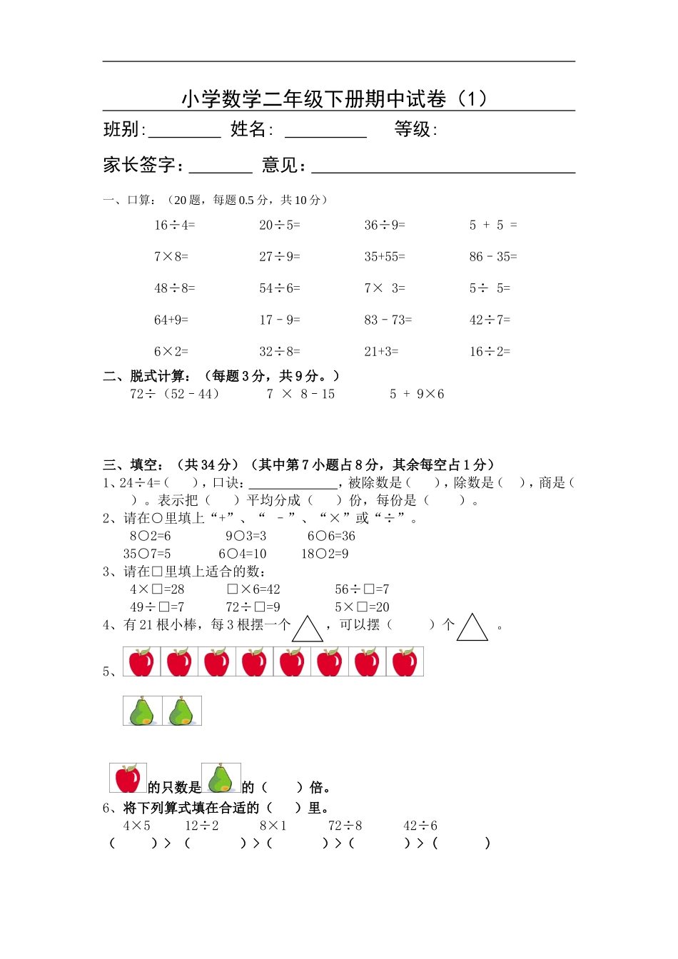 小学数学二年级下册期中试卷(1)班别:姓名:等级:家长签字:意见:一、口算:(20题,每题0.5分,共10分)16÷4=20÷5=36÷9=5+5=7×8=27÷9=35+55=86–35=48÷8=54÷6=7×3=5÷5=64+9=17–9=83–73=42÷7=6×2=3...