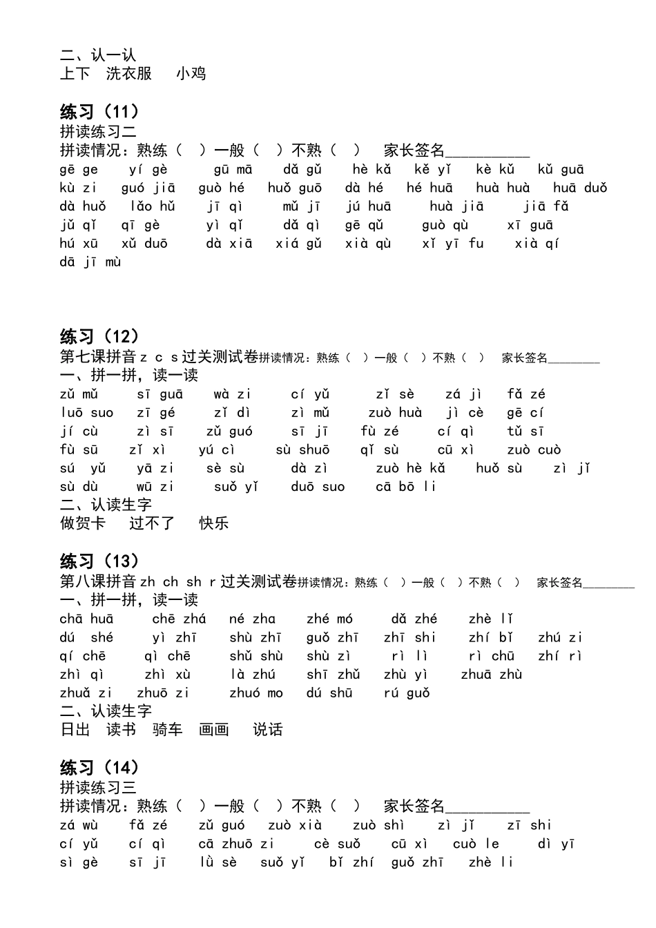 一年级汉语拼音拼读练习班级________姓名___________拼读是汉语拼音的重点,孩子会拼读了才可能借助拼音识字和阅读。因此,请根据老师布置的任务认真练习拼读。针对孩子当天的练习情况,在相应位置画勾并签字。多...