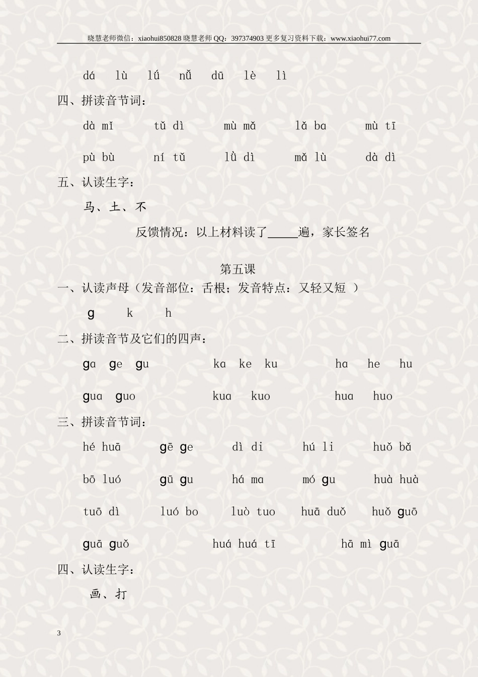 1晓慧老师微信:xiaohui850828晓慧老师QQ:397374903更多复习资料下载:www.xiaohui77.com汉语拼音每课检测和练习第一课一、认读单韵母(发音特点:又长又响亮)ɑoeāáǎàōóǒòēéěè二、以上内容打乱顺...