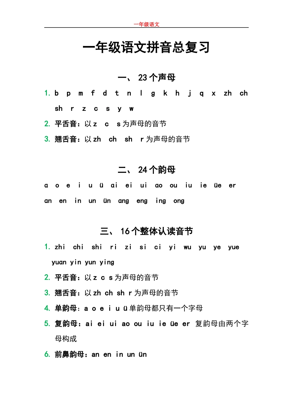 一年级语文一年级语文拼音总复习一、23个声母1.bpmfdtnlɡkhjqxzhchshrzcsyw2.平舌音:以zcs为声母的音节3.翘舌音:以zhchshr为声母的音节二、24个韵母ɑoeiuüɑieiuiɑoouiuieüeerɑneninunünɑnɡenɡinɡon...
