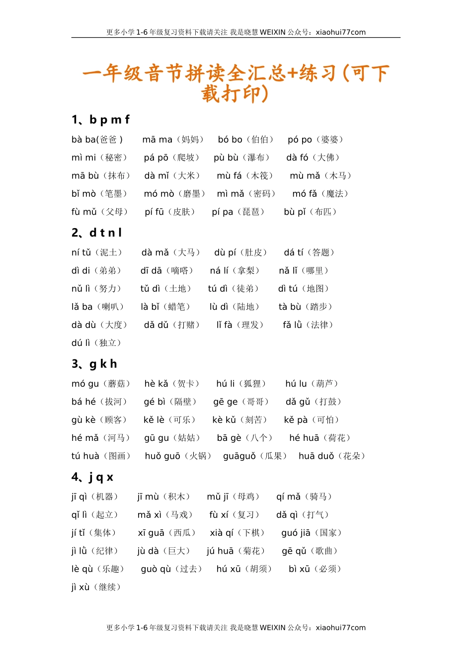 更多小学1-6年级复习资料下载请关注我是晓慧WEIXIN公众号:xiaohui77com一年级音节拼读全汇总+练习(可下载打印)1、bpmfbàba(爸爸)māma(妈妈)bóbo(伯伯)pópo(婆婆)mìmi(秘密)pápō(爬坡)pùbù(...