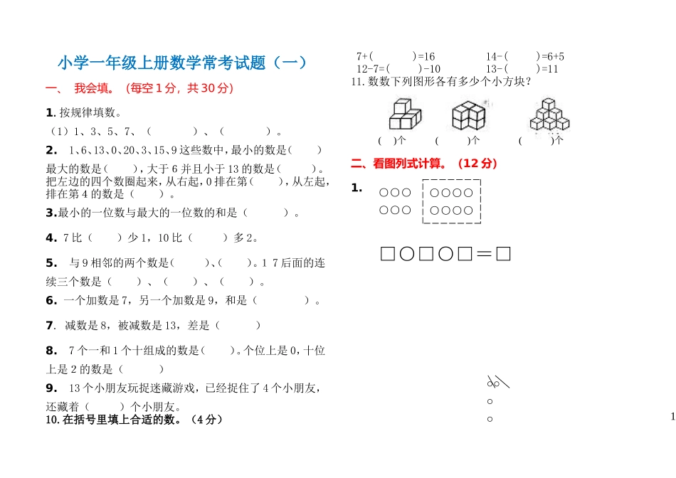 小学一年级上册数学常考试题(一)一、我会填。(每空1分,共30分)1.按规律填数。(1)1、3、5、7、()、()。2.1、6、13、0、20、3、15、9这些数中,最小的数是()最大的数是(),大于6并且小于13的数是(...