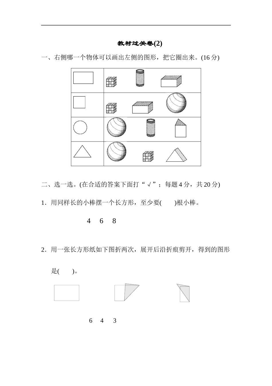 教材过关卷(2)一、右侧哪一个物体可以画出左侧的图形,把它圈出来。(16分)二、选一选。(在合适的答案下面打“√”;每题4分,共20分)1.用同样长的小棒摆一个长方形,至少要()根小棒。4682.用一张长方形纸如下图...