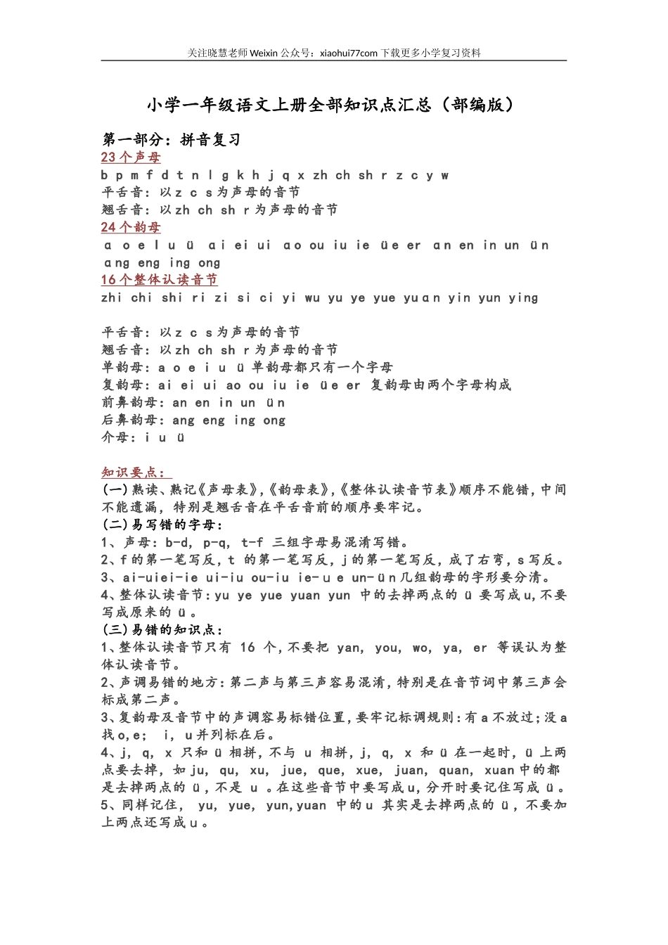 关注晓慧老师Weixin公众号:xiaohui77com下载更多小学复习资料小学一年级语文上册全部知识点汇总(部编版)第一部分:拼音复习23个声母bpmfdtnlɡkhjqxzhchshrzcyw平舌音:以zcs为声母的音节翘舌音:以zhchshr为...