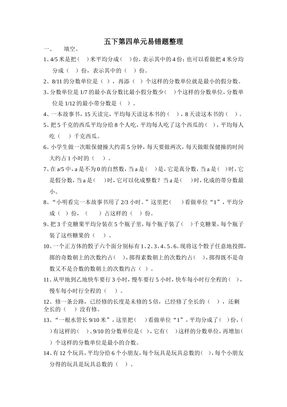 五下第四单元易错题整理一、填空。1、4/5米是把()米平均分成()份,表示其中的4份;也可以看做把4米分均分成()份,表示其中的()份。2、8/11的分数单位是(),再添()个这样的分数单位就是最小的假分数。...