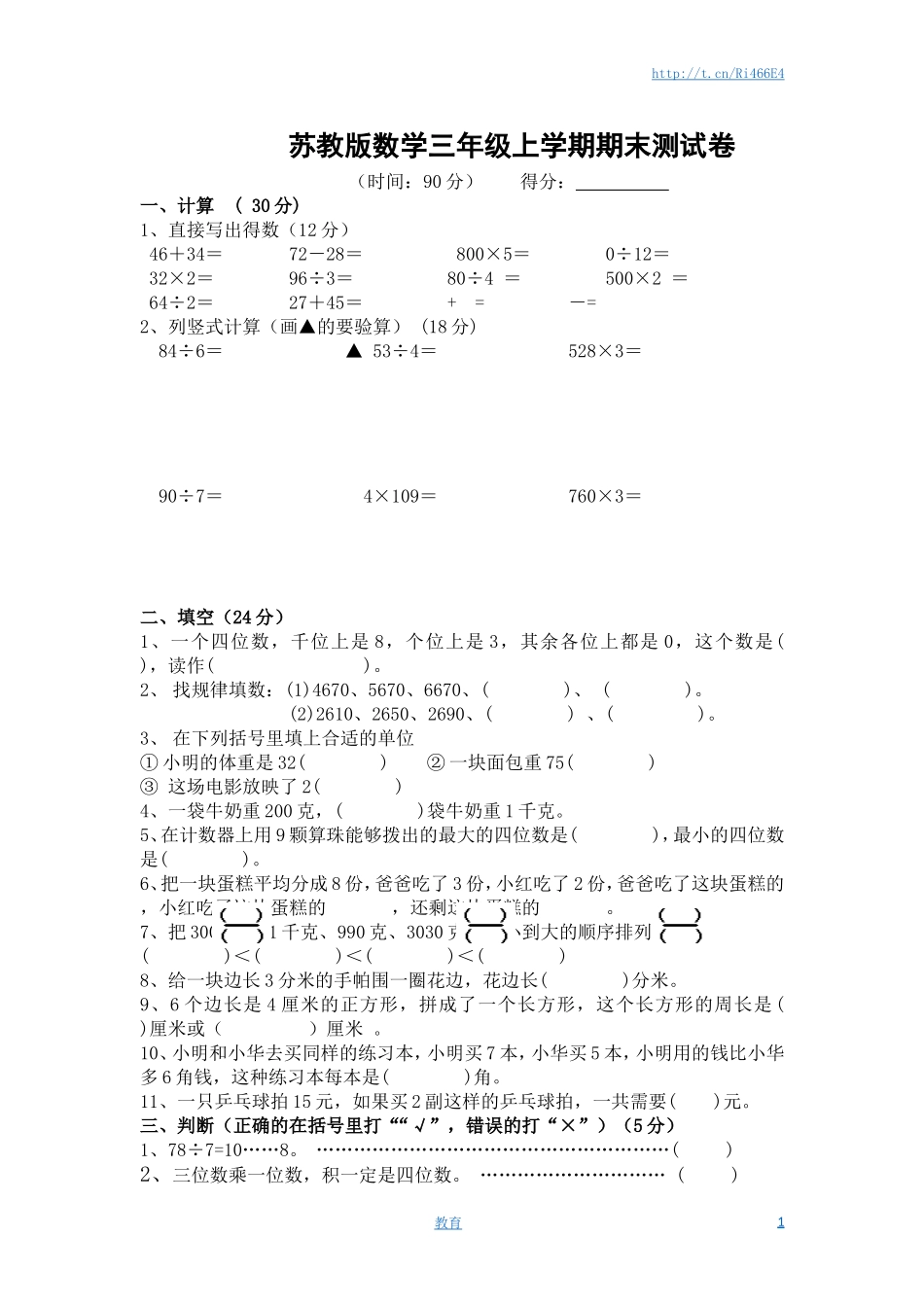 http://t.cn/Ri466E4苏教版数学三年级上学期期末测试卷(时间:90分)得分:一、计算(30分)1、直接写出得数(12分)46+34=72-28=800×5=0÷12=32×2=96÷3=80÷4=500×2=64÷2=27+45=+=-=2、列竖式...