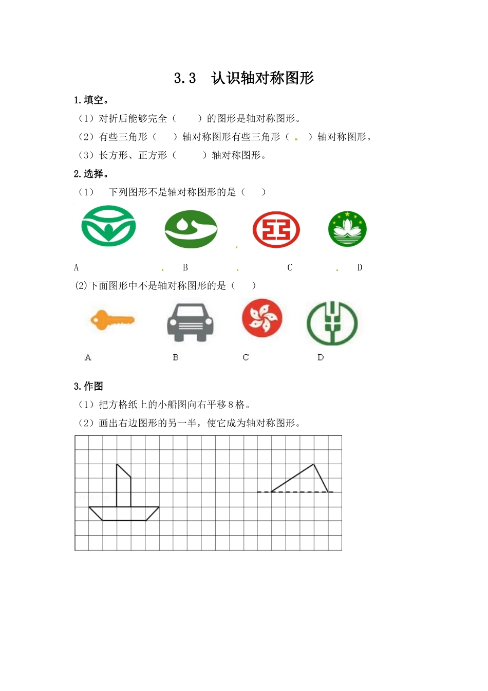3.3认识轴对称图形1.填空。(1)对折后能够完全()的图形是轴对称图形。(2)有些三角形()轴对称图形有些三角形()轴对称图形。(3)长方形、正方形()轴对称图形。2.选择。(1)下列图形不是轴对称图形的是...