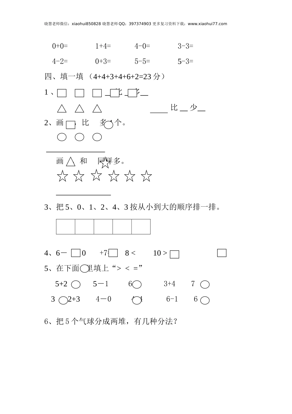 晓慧老师微信:xiaohui850828晓慧老师QQ:397374903更多复习资料下载:www.xiaohui77.com第一、二、三单元独立作业班级姓名学号成绩一、数一数,圈一圈。(8分)678967897、8、9、107、8、9、10二、连一连(6分)...