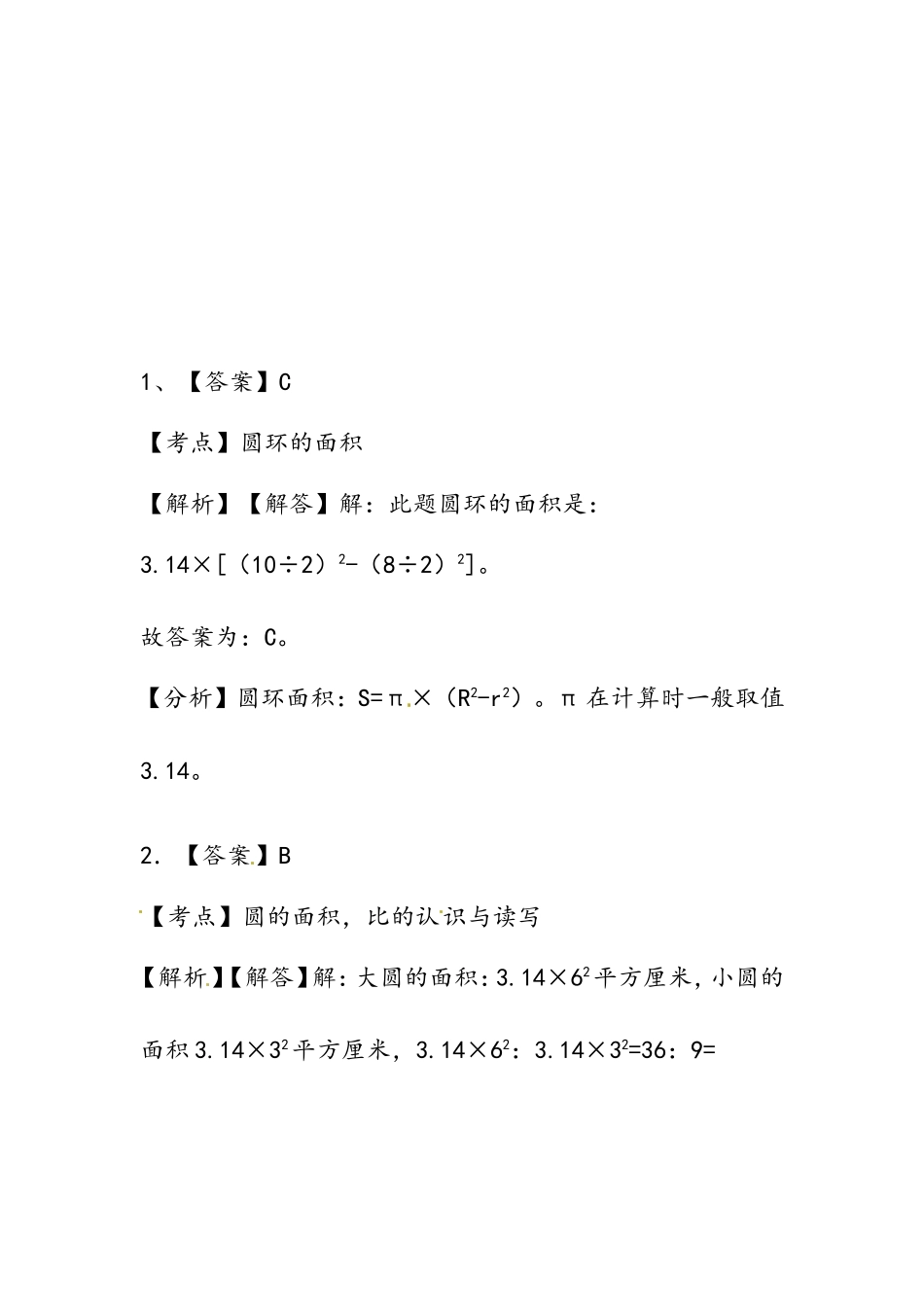 1.一个圆环,外圆直径是10cm,内圆的直径是8cm,求它的面积的正确算式是()。A.3.14×(102-82)B.3.14×(10-8)2C.3.14×[(10÷2)2-(8÷2)2]2.大圆的半径6cm,小圆的半径3cm,大圆和小圆面积的比是()...