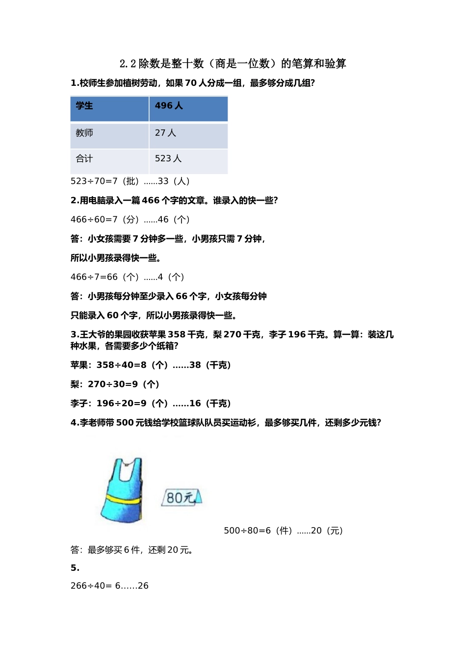 2.2除数是整十数(商是一位数)的笔算和验算1.校师生参加植树劳动,如果70人分成一组,最多够分成几组?学生496人教师27人合计523人523÷70=7(批)……33(人)2.用电脑录入一篇466个字的文章。谁录入的快一些?...