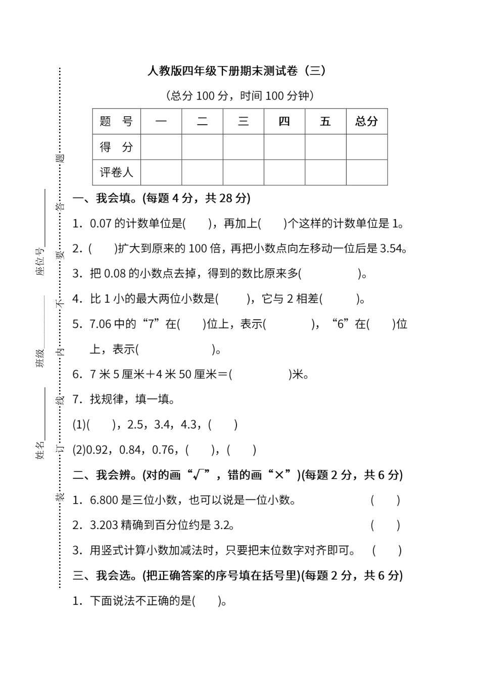 人教版数学四年级下册期末测试卷(三)及答案.pdf_第3页