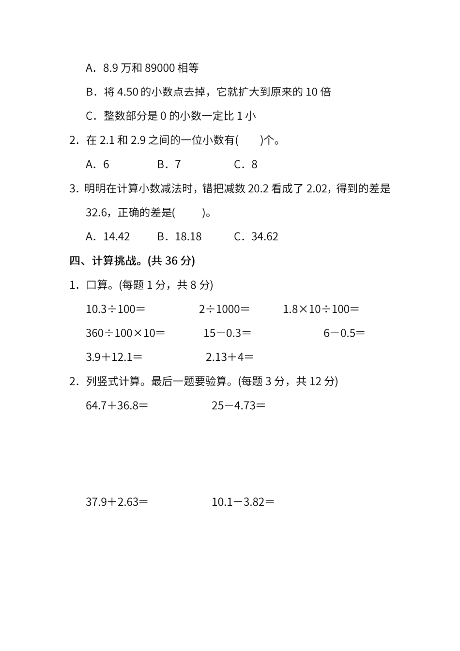 人教版数学四年级下册期末测试卷(三)及答案.pdf_第2页