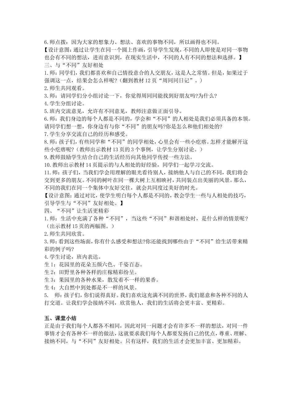 2不一样的你我他教案教学目标1.知识与能力通过学习认识到每个人都是不同的,了解自己的特点,感受到大家的不同使集体生活变得更加丰富多彩。2.过程与方法通过探讨“怎样与‘不同’友好相处”和““不同’让生活更...