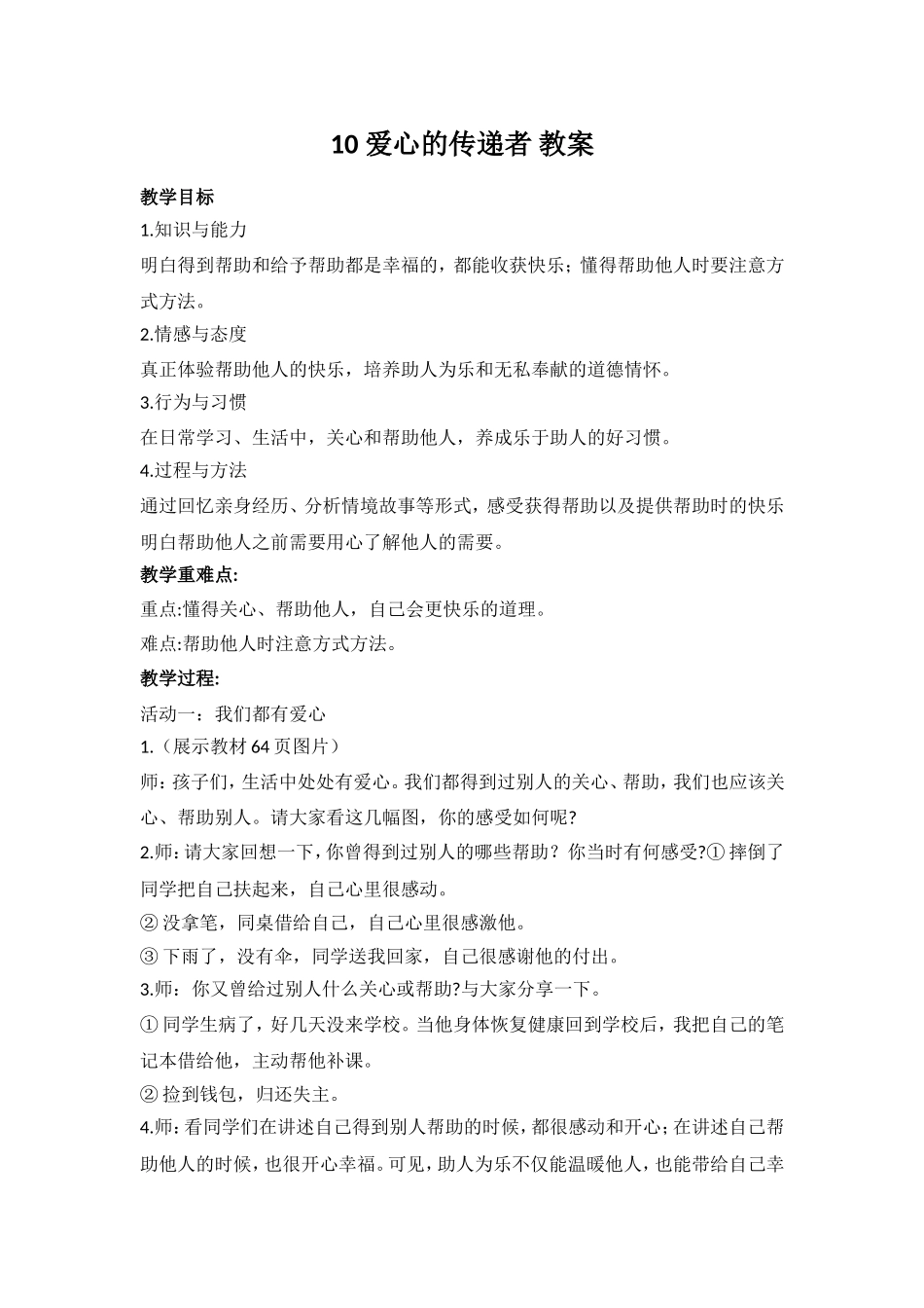 10爱心的传递者教案教学目标1.知识与能力明白得到帮助和给予帮助都是幸福的,都能收获快乐;懂得帮助他人时要注意方式方法。2.情感与态度真正体验帮助他人的快乐,培养助人为乐和无私奉献的道德情怀。3.行为与习...