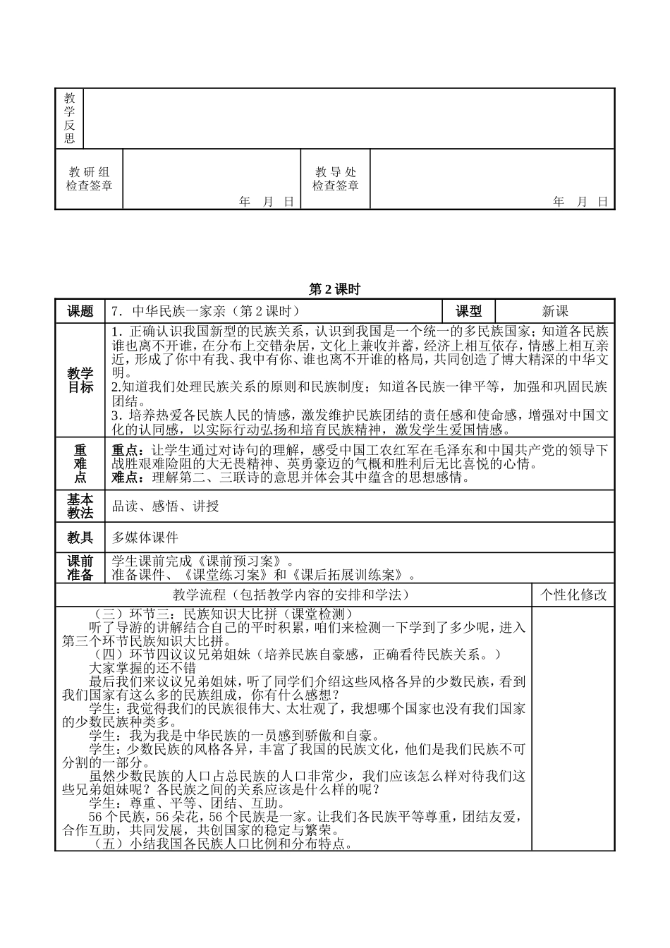第7课中华民族一家亲教案第周星期年月日课题7.中华民族一家亲(第1课时)课型新课教学目标1.正确认识我国新型的民族关系,认识到我国是一个统一的多民族国家;知道各民族谁也离不开谁,在分布上交错杂居,文化...