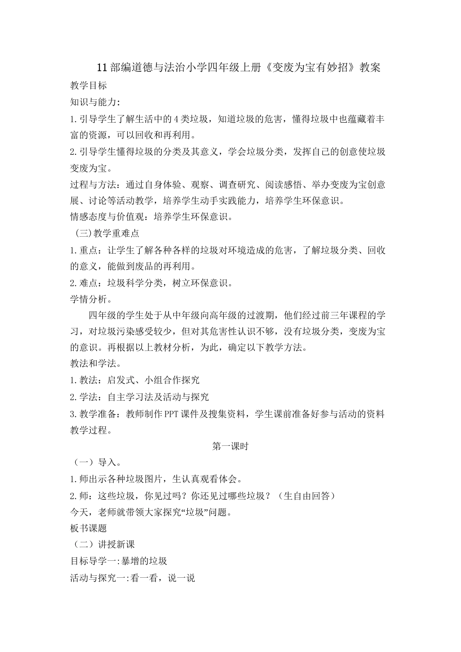 11部编道德与法治小学四年级上册《变废为宝有妙招》教案教学目标知识与能力:1.引导学生了解生活中的4类垃圾,知道垃圾的危害,懂得垃圾中也蕴藏着丰富的资源,可以回收和再利用。2.引导学生懂得垃圾的分类及其意...