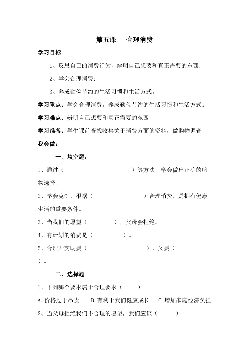 第五课合理消费学习目标1、反思自己的消费行为,辨明自己想要和真正需要的东西;2、学会合理消费;3、养成勤俭节约的生活习惯和生活方式。学习重点:学会合理消费,养成勤俭节约的生活习惯和生活方式。学习难点:...