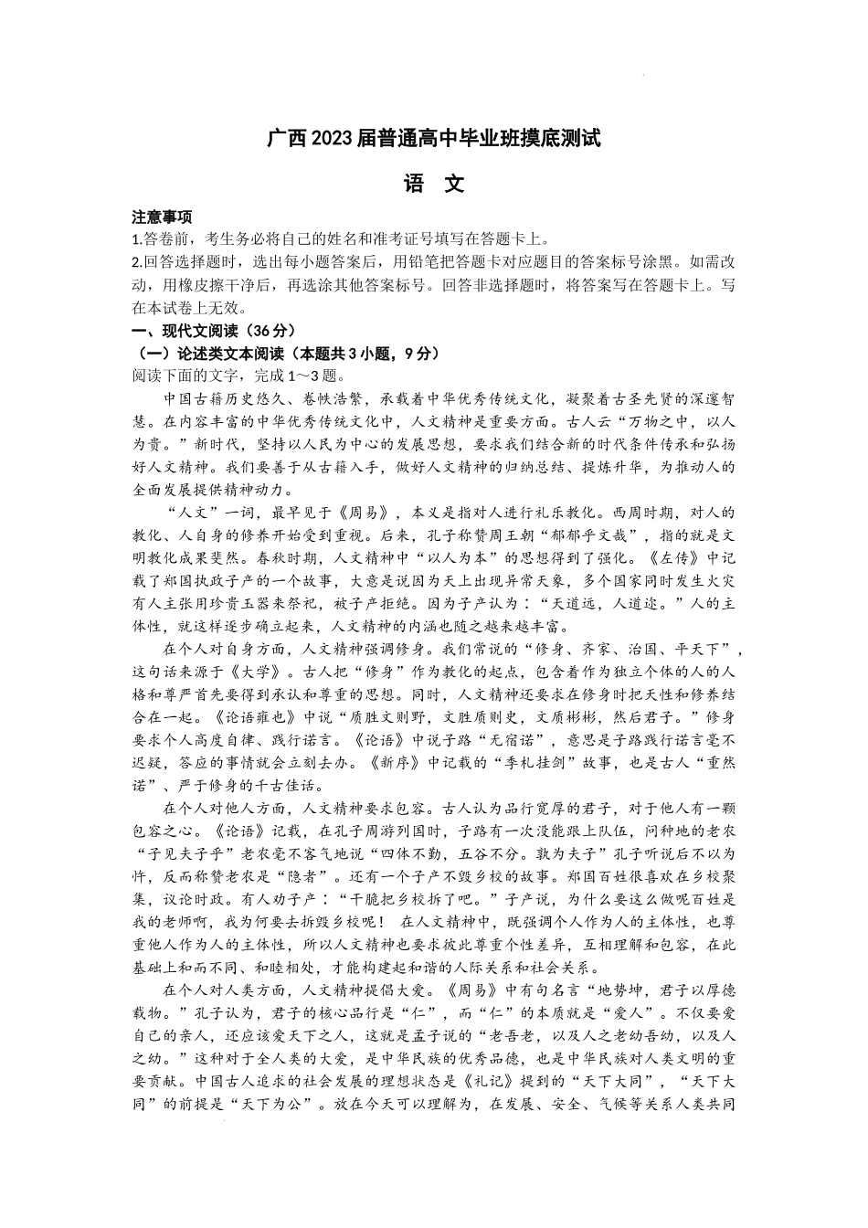 广西2023届普通高中毕业班摸底测试语文注意事项1.答卷前,考生务必将自己的姓名和准考证号填写在答题卡上。2.回答选择题时,选出每小题答案后,用铅笔把答题卡对应题目的答案标号涂黑。如需改动,用橡皮擦干净后...